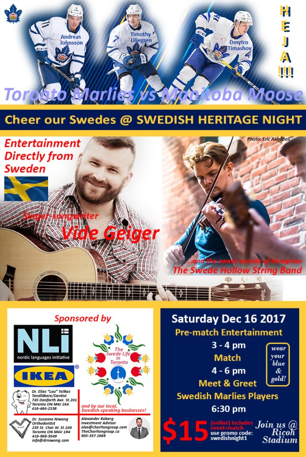 When:  Saturday, December 16th 2017 from 3-4 pm (pre-match Swedish Heritage Night event) and 4-6 pm (hockey match), Toronto Marlies vs. Manitoba Moose